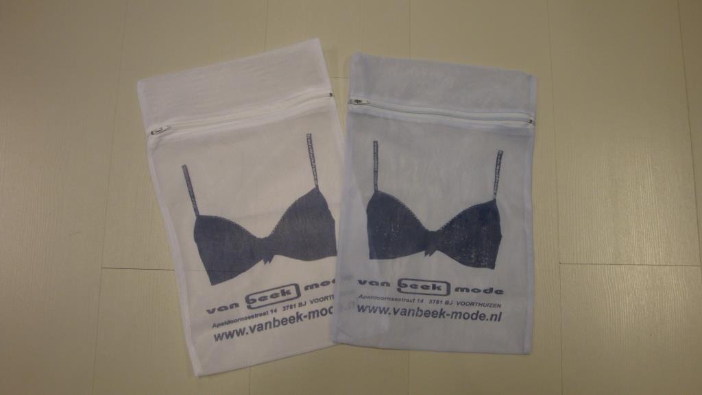 De linker is nieuw, de rechter is ±2 jaar gebruikt. Uiteraard door wasmiddel is de witte stof niet geheel wit gebleven, maar de print is zeker nog erg duidelijk te lezen. Zo wordt uw klant na elke wasbeurd weer even herinnerd waar ze zo fijn zijn geholpen. Praktisch en duurzaam als give-away en/of los te verkopen.